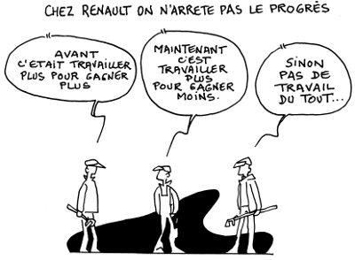 Et c’était bel et bien avec un chantage direct à l’emploi et aux fermetures de sites que le même Ghosn avait arraché en Espagne, le 13 novembre dernier, la signature d’un accord qu’il érige désormais en modèle : blocage des salaires qui ne seront réévalués que de la moitié de la hausse des prix, création d’une nouvelle catégorie d’embauches avec un salaire équivalent à 72,5 % de celui d’un agent de production actuel, réduction de 10 % des primes pour le travail de nuit, suppression des primes et des majorations pour cinq samedis obligatoires par an, augmentation de la durée annuelle du travail, avec trois jours de travail supplémentaire…