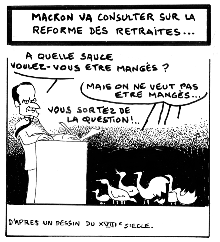 Et pour rassurer le monde des politiciens, à commencer par ceux de LREM qui craignent pour leur élection, il annonce que la nouvelle loi sur les retraites ne sera pas promulguée avant les élections municipales de 2020. Aux syndicats, il promet de tenir la jambe pendant au moins six mois à coups de rounds de marchandages. Et pour flatter sa clientèle, le gouvernement pourrait lancer à l’échelle du pays un nouveau « Grand débat », du cause toujours.