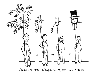 L’Inde reste toutefois la quatrième puissance agricole mondiale et la misère n’est pas pour tout le monde. À la fin des années 1960, pour réduire la dépendance alimentaire, l’État avait fortement subventionné les grands propriétaires, développant l’irrigation, le crédit et les équipements pour le stockage et la distribution, poussant à l’utilisation de semences à haut rendement et d’engrais chimiques. C’était la « révolution verte ». Mais l’agriculture intensive n’était pas adaptée à la majorité de petits propriétaires, disposant de moins d’un hectare. Ce sont eux qui subissent maintenant de plein fouet la politique de l’OMC, tandis que la minorité de grands propriétaires, tournée vers l’exportation, en profite et rachète les terres des plus petits ruinés.