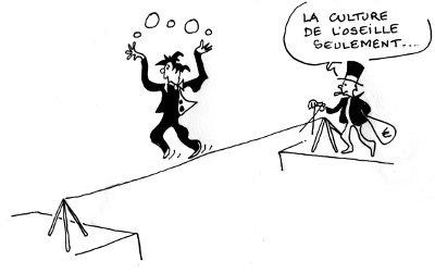En abordant début février la renégociation de la Convention d’assurance chômage, le patronat, qui venait de recevoir du gouvernement les 30 milliards d’euros du « pacte de responsabilité », a demandé la suppression pure et simple du régime des intermittents du spectacle. La ministre de la culture, Aurélie Filippetti, répliquait que le Medef voulait « tuer la culture » et qu’il cherchait « un bouc émissaire ». Les déclarations préliminaires du Medef avaient été si péremptoires que l’ex-patronne du Medef, Laurence Parisot, enchérissait sur la ministre socialiste : « La culture et l’économie (...) peuvent avoir des synergies très vertueuses », déclarait-elle, en précisant : « Si vous avez envie de discuter, si vous êtes un dirigeant chinois, d’un prochain Airbus à acheter, c’est aussi parce qu’avant vous avez été admiratif de la culture française ! ». Les intermittents sont en effet les premiers à remarquer que les programmes de spectacles ou les génériques de films sont toujours plus infestés des logos des grandes entreprises.