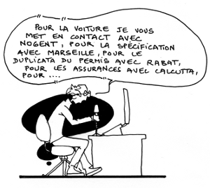 Aujourd’hui, lorsque l’héritier d’un client individuel veut racheter son contrat d’Assurance Vie suite à un décès, l’acte du notaire arrive à une adresse postale, est orienté vers un centre où il est scannérisé, devient un objet informatique, puis arrive dans la corbeille informatique d’un service d’indexation où on le rattache à un client ou à un numéro de contrat, avant d’atterrir dans un service à Angers chargé de trier les assurances vie en plusieurs « tas », selon le volume et la complexité des dossiers. La lettre arrive donc dans la corbeille informatique (et non plus papier) d’un télé conseiller d’une filiale d’Axa à Rabat qui va la traiter. Le client, s’il rappelle, tombera sur un employé à Angers, Puteaux ou Rabat.