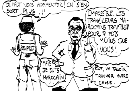 Quant aux salaires, les ouvriers marocains seront payés 250 euros bruts par mois, c’est à dire pas grand chose vu le coût de la vie au Maroc. C’est que gagnaient en moyenne les ouvriers de l’usine Dacia de Pitesti, propriété de Renault en Roumanie, avant d’arracher en 2008 au bout de trois semaines de grève, 100 euros d’augmentation de salaire. Une première brèche, et de taille, dans leurs salaires low cost qui sont passés aujourd’hui à 450 euros en moyenne.