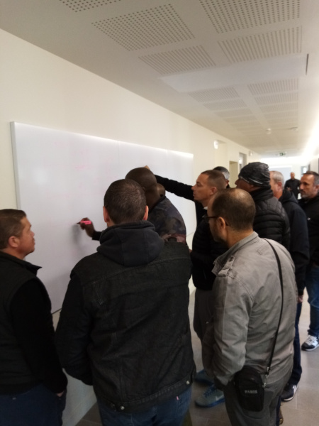 Pour avoir des nouvelles fraiches du dépôt voisin, et pour leur donner de la force, deux voitures de grévistes partent à Cesson, où une AG est prévue pour discuter du protocole de fin de conflit, proposé par la direction de là-bas. Un gréviste de Lieusaint qui l’a imprimé et a passé la matinée à le décortiquer l’explique à la ronde. L’esprit général semble très loin de la signature. « Avant quand j’allais au travail, j’étais content, j’avais l’impression de partir en balade. Maintenant je me sens juste comme un conducteur de poids lourd, avec des légumes comme cargaison. On venait en avance pour faire des parties de babyfoot, et on faisait même pousser de la menthe devant pour mettre dans le thé. Maintenant tout le monde vient à reculons, tellement ils ont cassé le travail ! Tous ces mecs en col blanc qui font leurs profits sur notre dos, ils en ont rien à faire de nous, les conducteurs, et toute la classe ouvrière. Ils ont enlevé la taxe d’habitation, mais ils ont augmenté le gasoil. » C’est la lutte des classes : les travailleurs n’ont rien à attendre des directions et des gouvernements, et ne peuvent compter que sur leurs forces pour arracher de bonnes conditions de travail et de vie par la lutte. Les grévistes de Lieusaint, Cesson, et Combs-la-Ville le sentent, et ils sont soixante-dix à se réunir en AG.