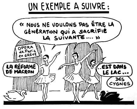 Le 24 décembre, les « petits rats » de l’Opéra de Paris en grève interprètent le « Lac des cygnes » sur le parvis du Palais Garnier. À la clause du grand-père, ils répondent : « Nous ne serons pas la génération qui aura sacrifié les suivantes. »